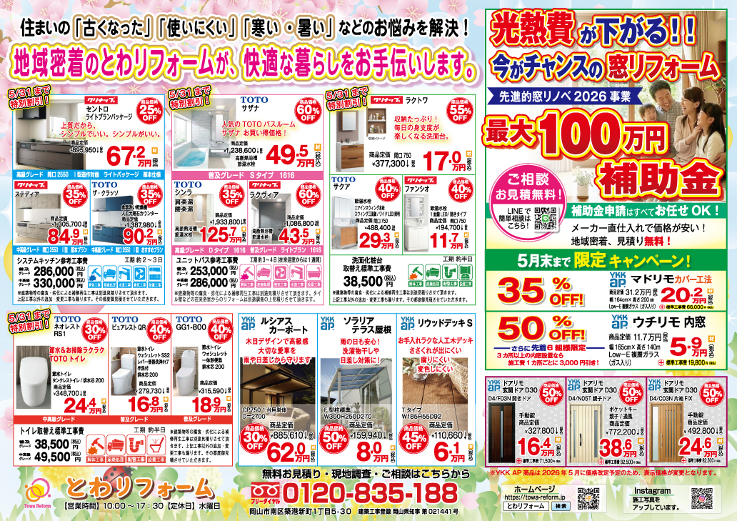 とわリフォームは岡山一「笑顔」を咲かせる地域密着総合リフォーム店を目指し、お客様のお悩み解決に惜しみなく力を尽くします。