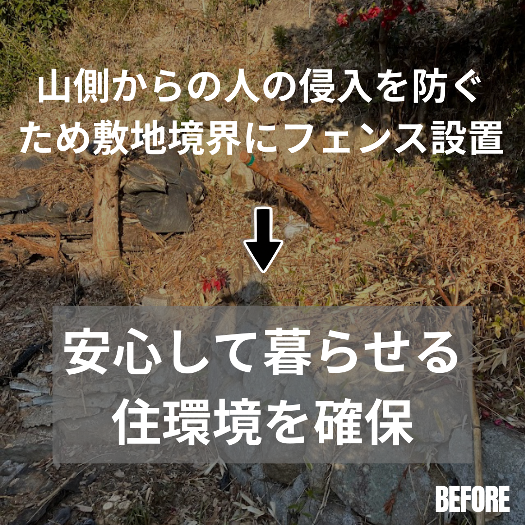 これまで山側との境界線があいまいな状態で、「知らない人が敷地内に入ってしまわないか」という不安を感じておられたとのことです。