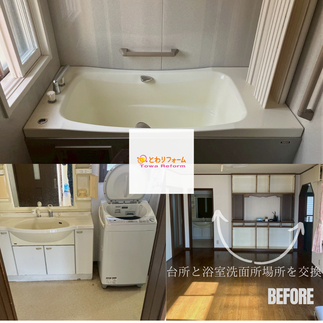 元々は、リビングダイニングのお部屋の奥に位置していた浴室・洗面脱衣所の壁を撤去してLDKのスペースとして広げ、逆に元々壁付けの独立したキッチンがあった部屋に浴室・洗面脱衣所を移設する工事を行いました。